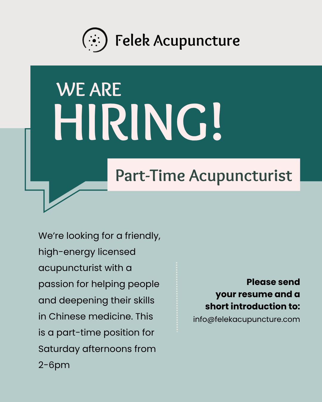 We are currently hiring a part-time acupuncturist for Saturday afternoons from 2-6pm. If you’re interested please send your resume and a short introduction to: